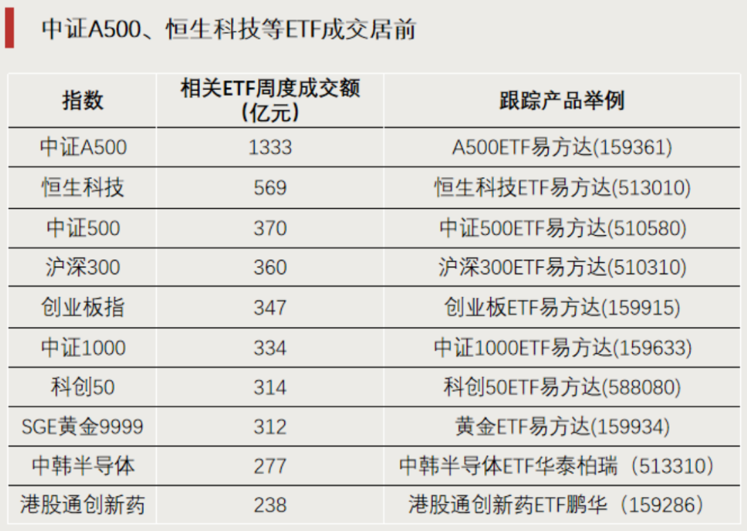 A500ETF易方达(159361)跟踪的中证A500指数相关ETF合计成交额超1300亿元,位居指数成交榜首位;科创50ETF易方达(588080)、创业板ETF易方达(159915)、中证500ETF易方达(510580)、沪深300ETF易方达(510310)所跟踪指数的合计成交额均位居前列,均超过300亿元。