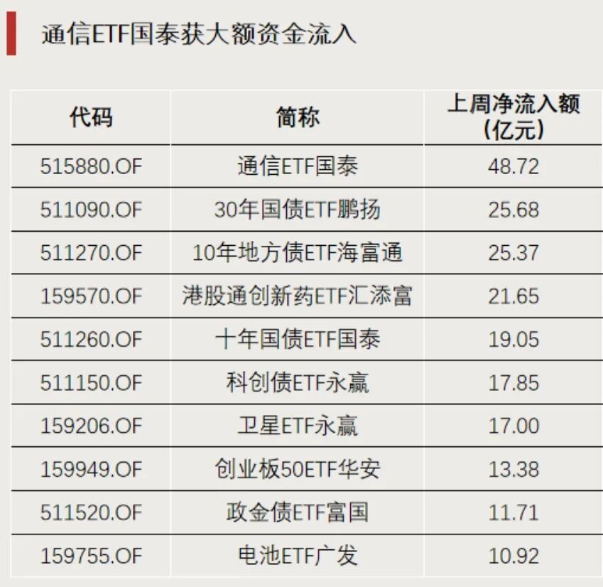上周,主题赛道ETF受到资金关注。通信ETF国泰以48.72亿元的周净流入额居榜首,获资金集中加仓。港股通创新药、卫星、电池等主题ETF也获得超10亿元资金净流入。