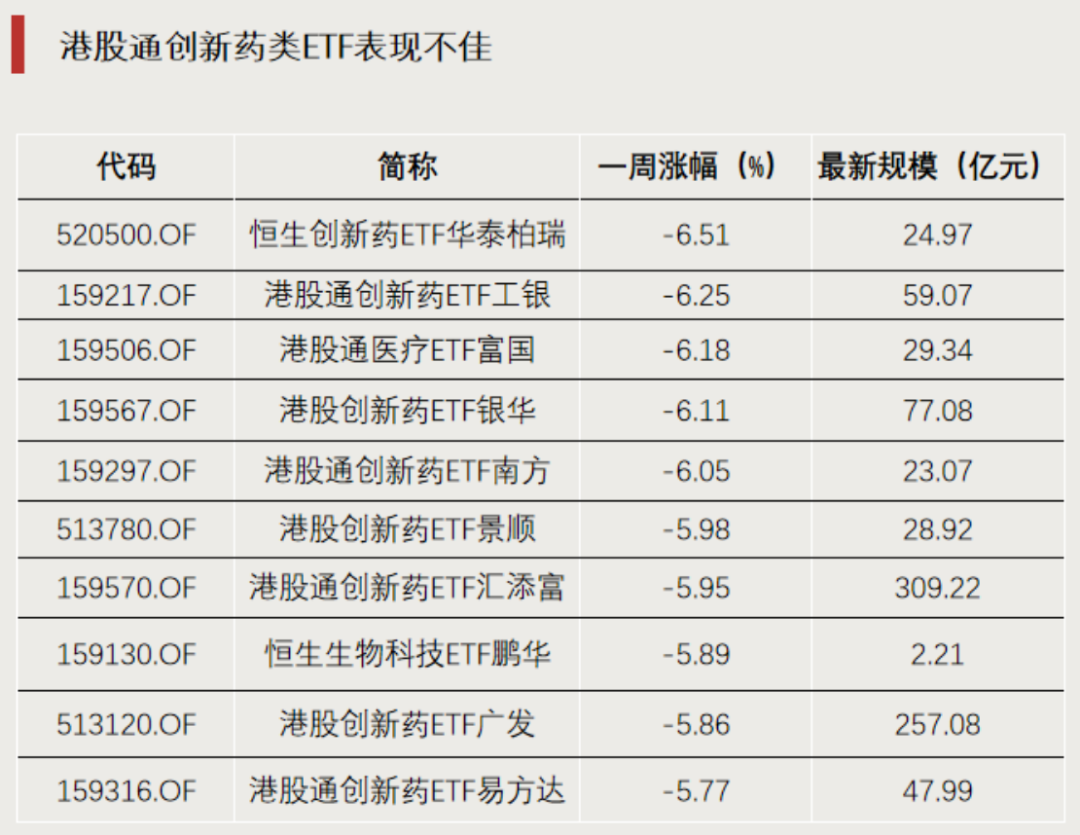 恒生创新药ETF华泰柏瑞领跌,周跌幅为6.51%。工银、银华、南方等多家基金公司旗下港股通创新药ETF同步大幅走弱,跌幅均超6%。此外,港股通医疗ETF富国跌超6%,恒生生物科技ETF鹏华下跌5.89%。