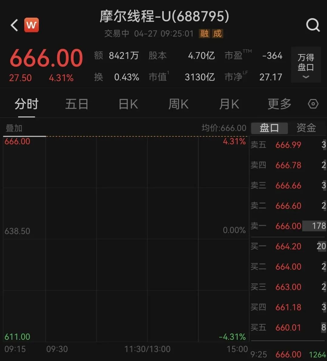 “国产GPU第一股”摩尔线程今天开盘上涨4.31%,报666元/股。截至9:40,公司股价报666.59元/股,涨4.40%。
