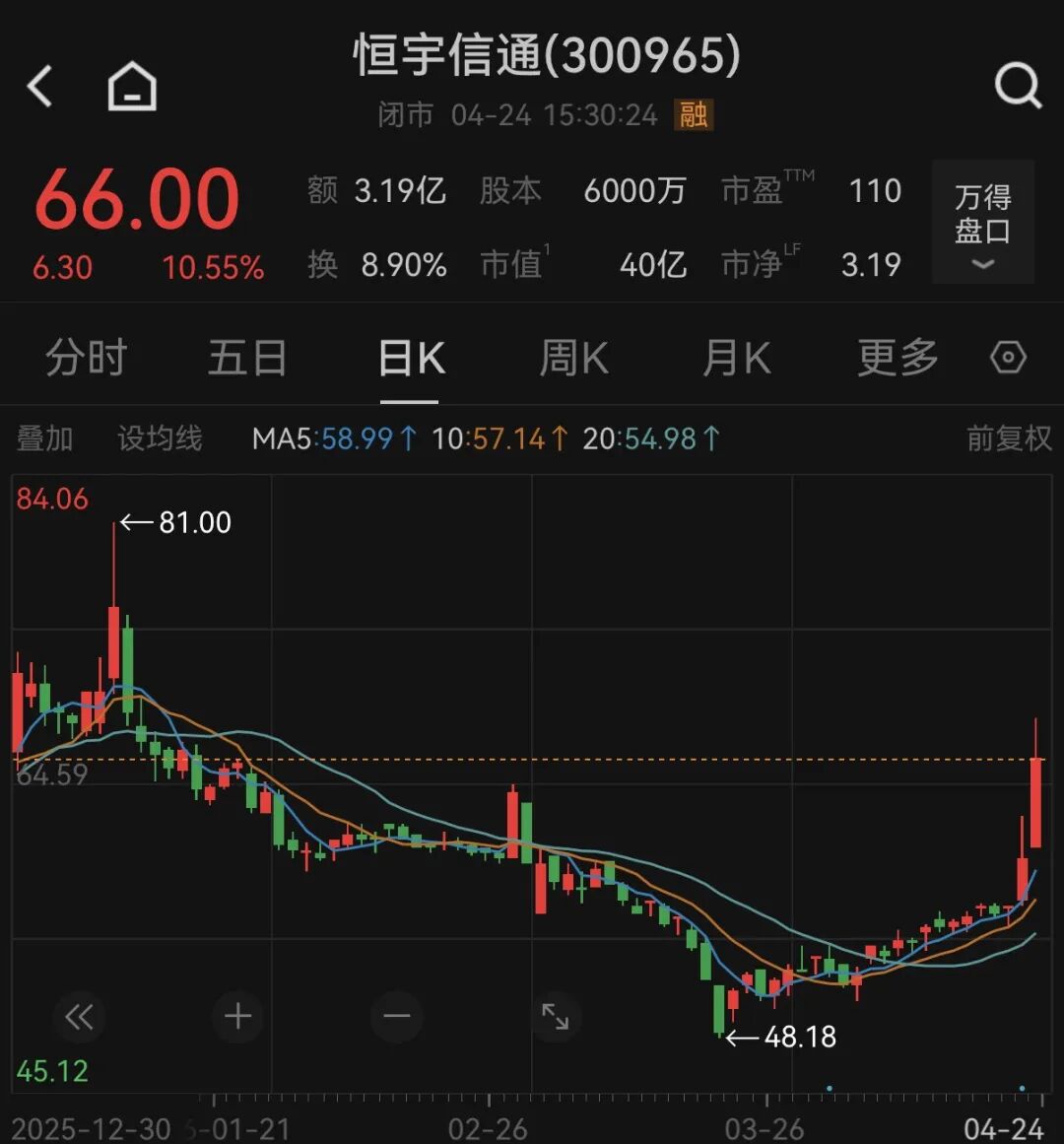 Wind数据显示,4月24日, 恒宇信通股价收报66元/股,涨幅为10.55%,市值为40亿元。值得注意的是,恒宇信通股价于1月12日触及阶段高点后持续回落, 4月23日、24日连续两个交易日,在 航空航天板块拉升带动下,股价大幅上涨。今年以来,该股累计跌幅为6.57%。