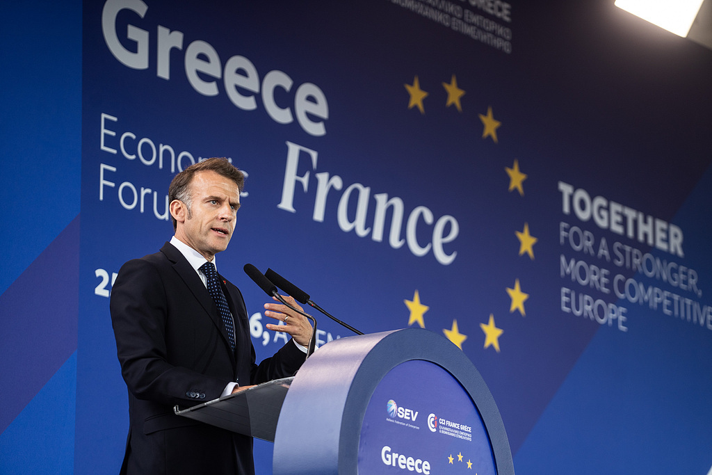 当地时间2026年4月25日,希腊雅典,法国总统埃马纽埃尔·马克龙在希腊-法国经济论坛上发表演讲。视觉中国 图