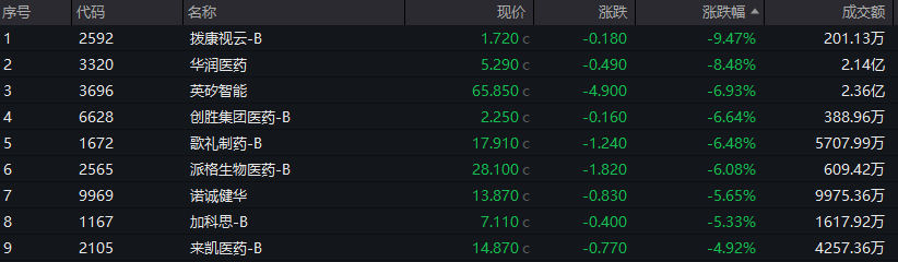 生物医药板块走低,歌礼制药-B跌超6%,派格生物医药-B跌超6%,银诺医药跌超5%。
