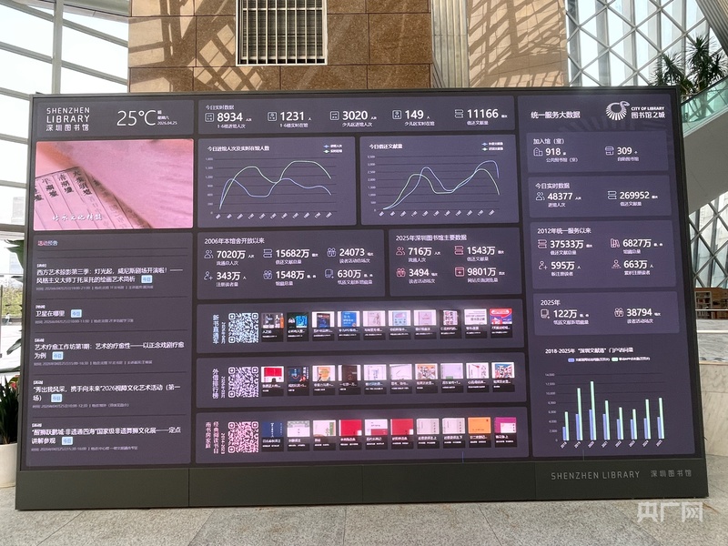 深圳图书馆入口处的电子屏上的实时数据显示,仅4月25日当天,进馆人次近九千人,借还文献量超过一万一千册次。