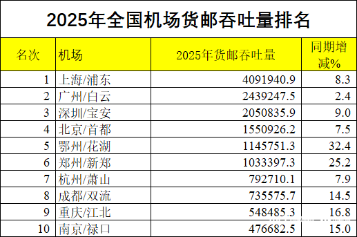 大湾区“双核驱动”——广州白云(243.9万吨)与深圳宝安(205.1万吨)双双突破200万吨,合计近450万吨。这一体量已接近上海两场之和,印证了珠三角先进制造业与跨境电商集群的强大物流需求。