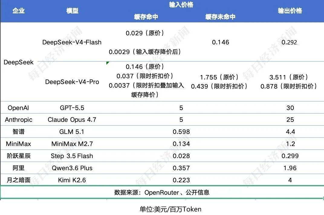 要知道,在本次连续两日降价之前,DeepSeek-V4的价格本就极具“杀伤力”。同样处理百万Token的输入与输出,GPT-5.5和Claude Opus 4.7的合计成本分别是35美元和30美元。而DeepSeek-V4-Pro仅需5.27美元。如果输入命中缓存,输入价格进一步降至每百万Token 0.145美元,合计成本降至3.66美元。