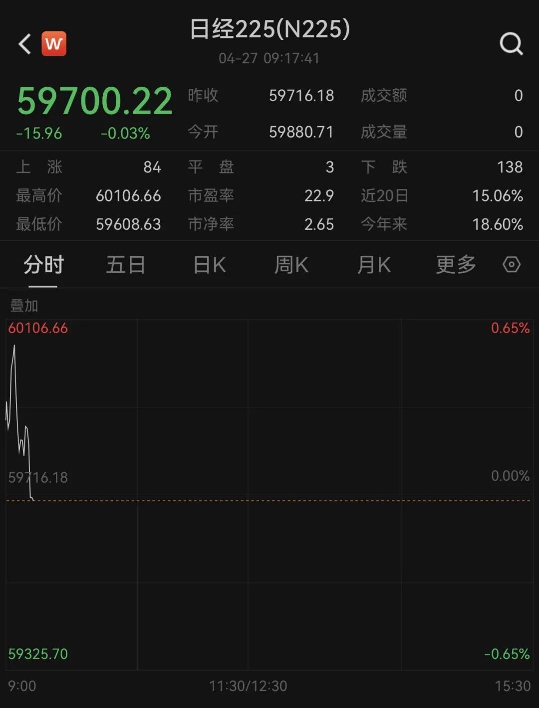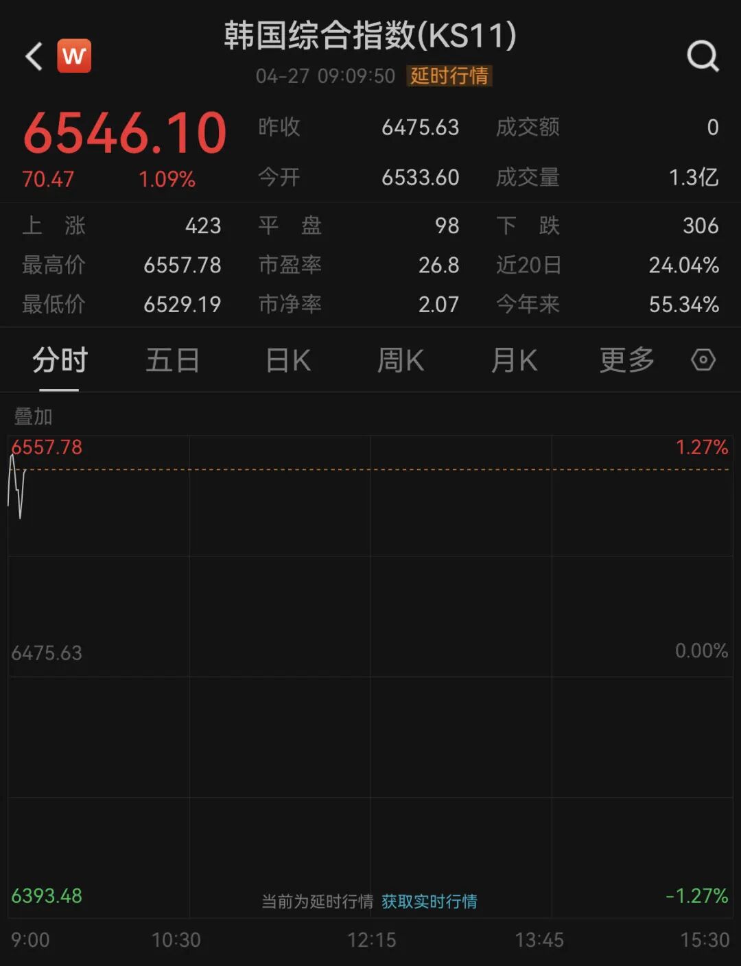 日韩股市早盘集体上涨,随后走势分化,截至发稿,日经225指数跳水翻绿,现微跌0.03%;韩国综合指数涨超1%,盘中创出历史新高。