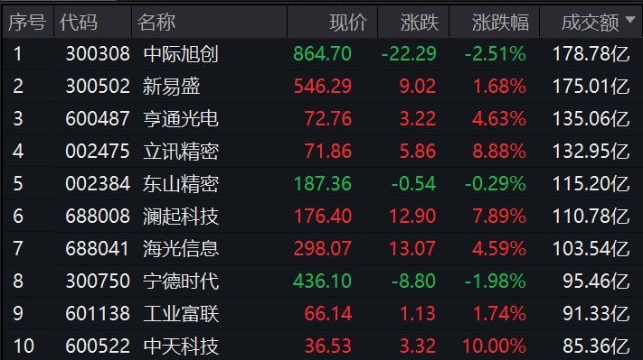 个股方面,中际旭创半日成交额超178亿元居首,新易盛、亨通光电、立讯精密成交额靠前。