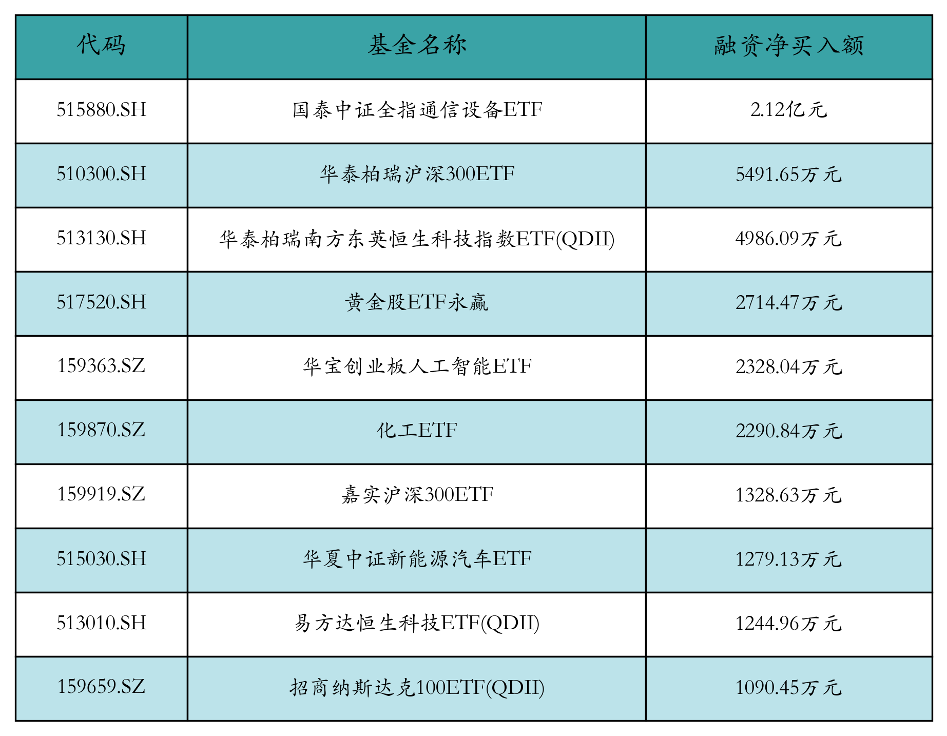 4月24日ETF融资净买入额前三位分别为:国泰中证全指通信设备ETF(2.12亿元)、华泰柏瑞沪深300ETF(5491.65万元)和华泰柏瑞南方东英恒生科技指数ETF(QDII)(4986.09万元),前10具体见下表: