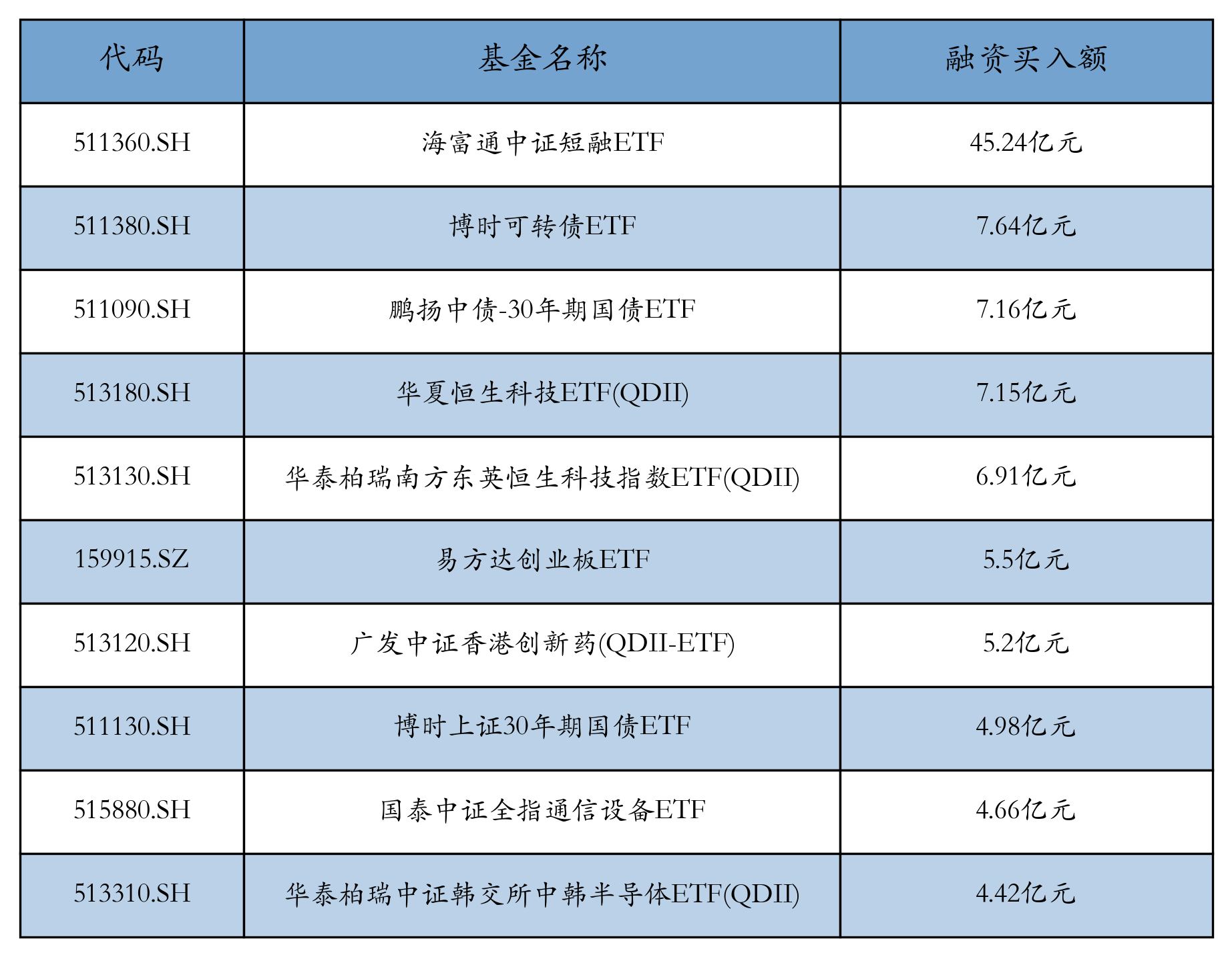 4月24日ETF融资买入额前三位分别为:海富通中证短融ETF(45.24亿元)、博时可转债ETF(7.64亿元)和鹏扬中债-30年期国债ETF(7.16亿元),前10具体见下表: