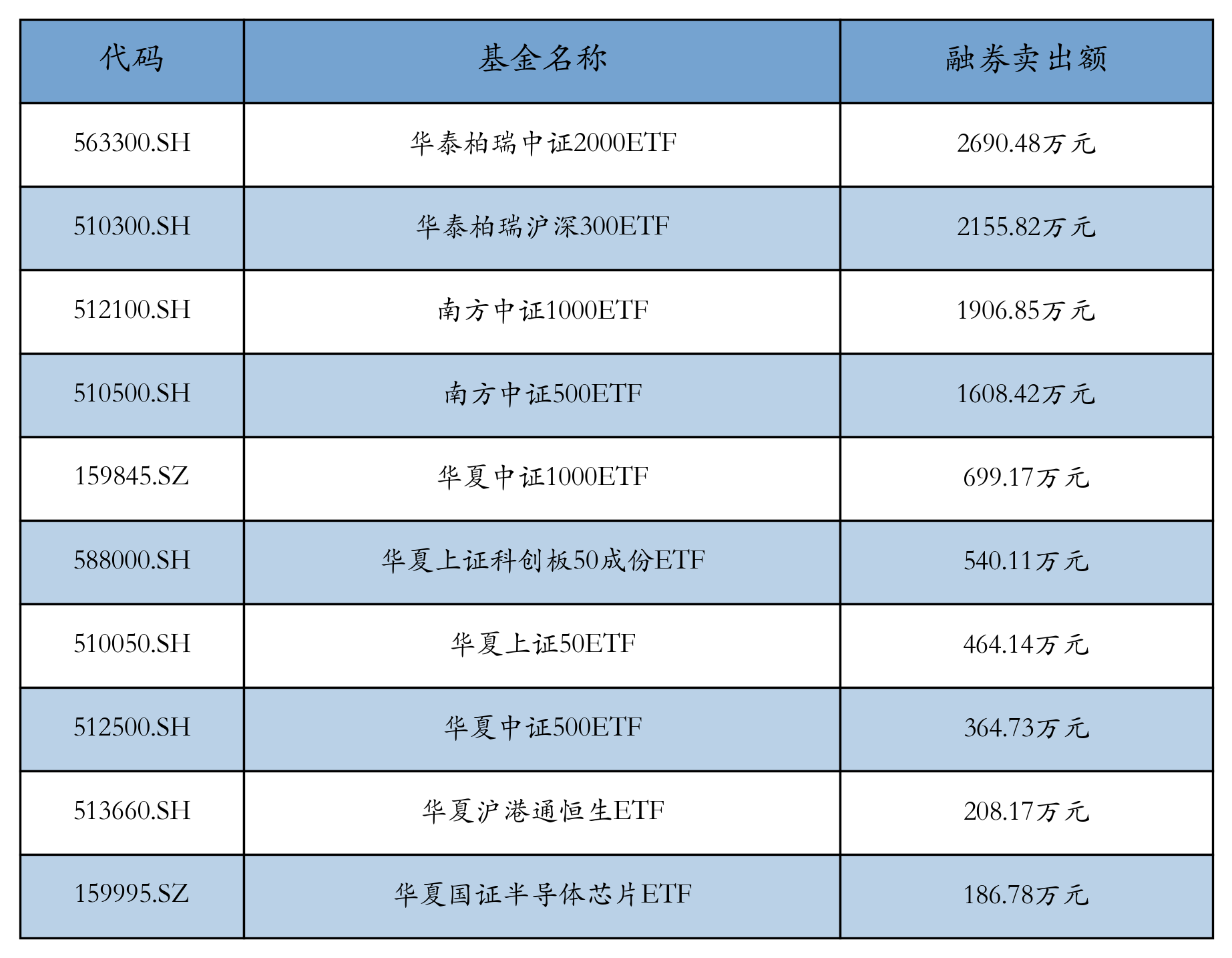 4月24日ETF融券卖出额前三位分别为:华泰柏瑞中证2000ETF(2690.48万元)、华泰柏瑞沪深300ETF(2155.82万元)和南方中证1000ETF(1906.85万元),前10具体见下表: