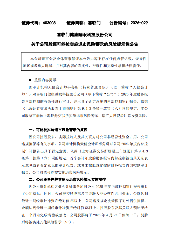 2026年4月25日晚间,喜临门健康睡眠科技股份有限公司(喜临门,证券代码:603008)连续发布两份重要公告:公司因内部控制被出具否定意见、存在控股股东资金占用及违规担保情形,将于4月27日停牌一天,4月28日起被实施其他风险警示,股票简称正式变为ST喜临门。与此同时,公司因信息披露违法违规,正处于证监会立案调查阶段,多重风险集中引爆。