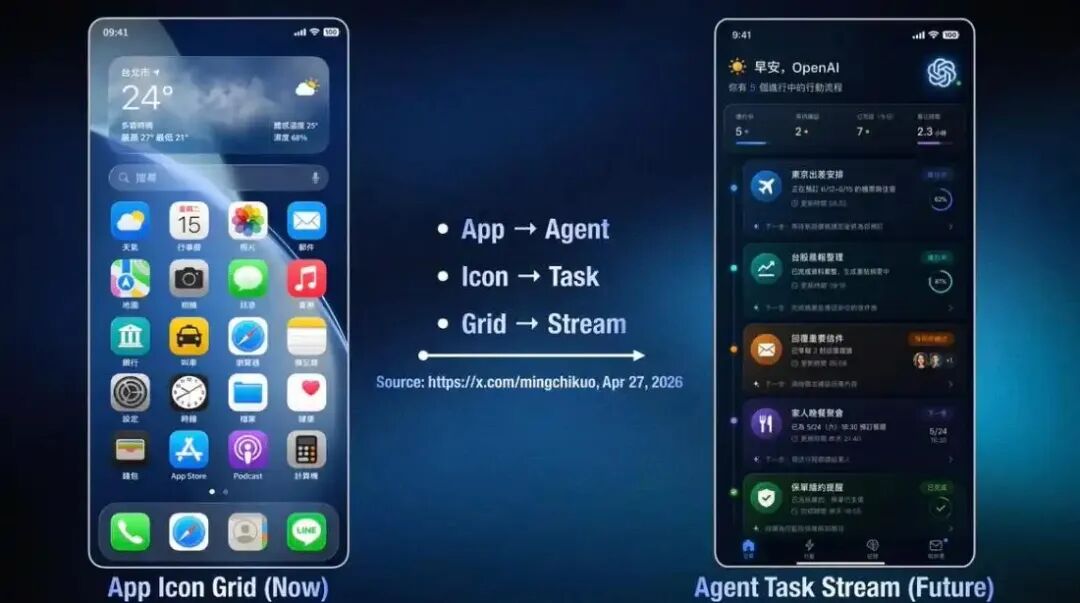 在郭明錤看来,AI智能体重新定义手机,用户不再是为了使用一堆应用程序,而是通过手机执行任务并满足各种需求。这从根本上改变了人们对手机的认知。他还给出了手机界面概念设计图,并与当前手机(以iPhone为例)进行对比。