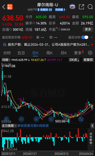 截至4月24日收盘,摩尔线程股价报638.50元/股,涨幅达5.43%,总市值为3001亿元。