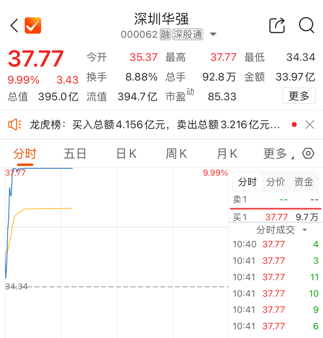 早盘,华为昇腾概念板块爆发,深圳华强开盘迅速拉升,直线涨停,报37.77元/股,市值超390亿元,此前一个交易日,该股亦录得涨停;朗科科技、亚康股份等多股跟涨。