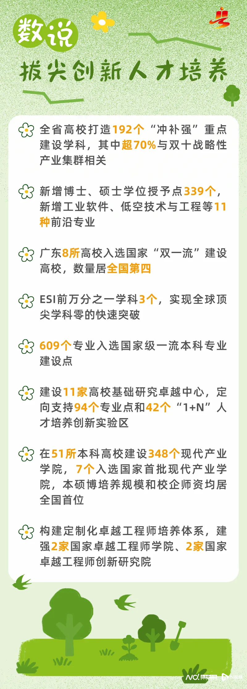“十四五”以来,广东锚定教育强国、教育强省建设目标,以服务国家和粤港澳大湾区新质生产力发展为使命,以“冲补强”计划为总抓手,将拔尖创新人才培养作为核心使命,系统性布局、全方位发力、超常规突破,构建起适配国家战略、对接产业前沿、引领未来发展的人才培育体系,为新质生产力发展注入了源源不断的创新人才动能。