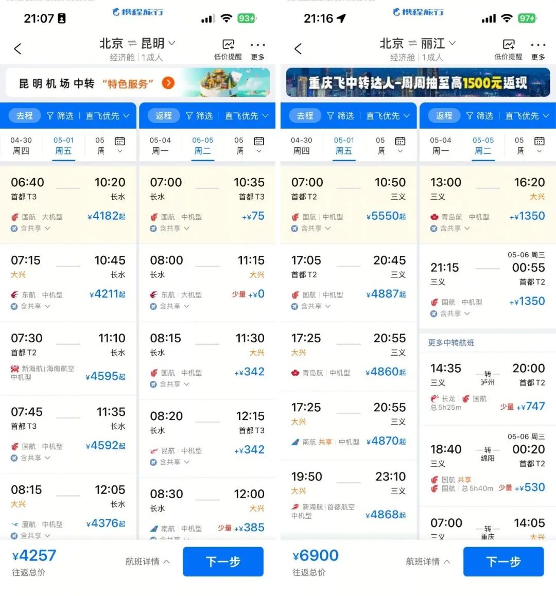 但是今年“五一”,丽江、昆明、大理、腾冲……往返门槛基本都到了五千。