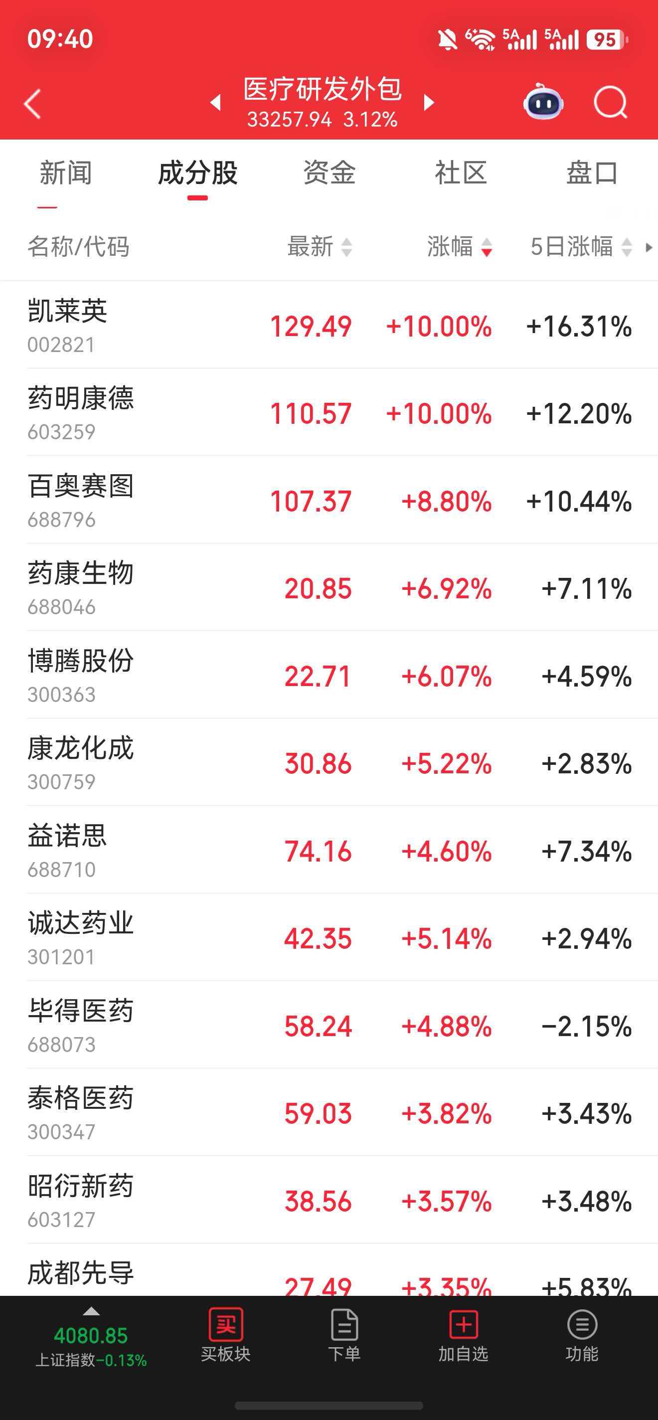 早盘开盘仅5分钟,药明康德(603259.SH)便强势封死涨停板,股价创年内新高;凯莱英(002821.SZ)紧随其后涨停,康龙化成、昭衍新药等产业链个股普遍大涨超4%。