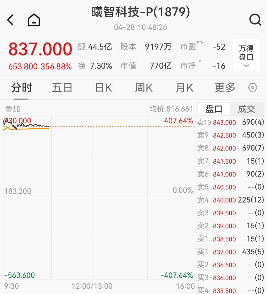 4月28日,港股新股“全球AI硅光芯片第一股”曦智科技(1879.HK)上市,截至10:48,报837港元/股,涨356.88%,总市值为770亿港元。