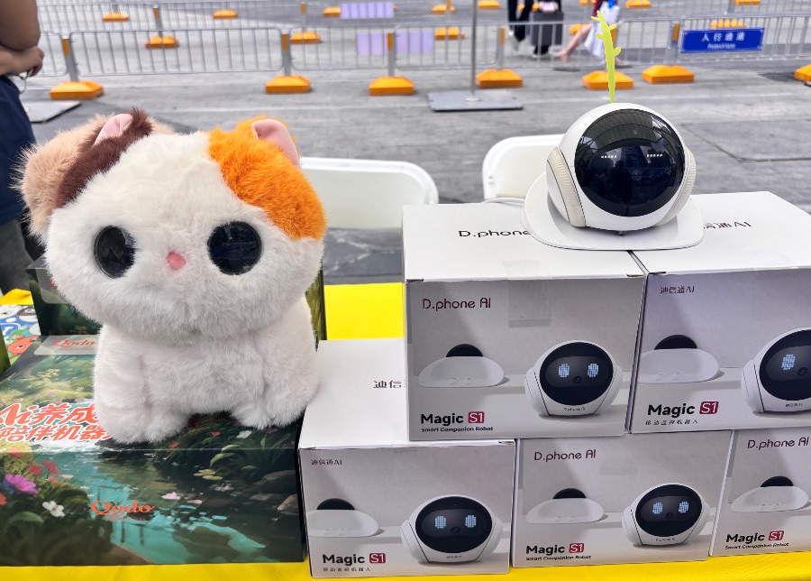 记者观察到,入选第二期“AI八骏”的迪信通Magic S1移动监控机器人,可通过手机客户端控制,实现全屋智能巡逻、异地语音陪伴、宠物互动、智能侦测报警等功能。企业展位前,机器人实时逗猫逗狗的功能尤为引人驻足关注。