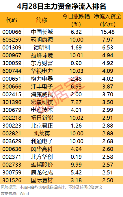 服务器概念股中国长城主力资金净流入金额居首,达15.48亿元,收盘上涨6.32%。医药龙头药明康德涨停,主力资金净流入7.97亿元,居次席。