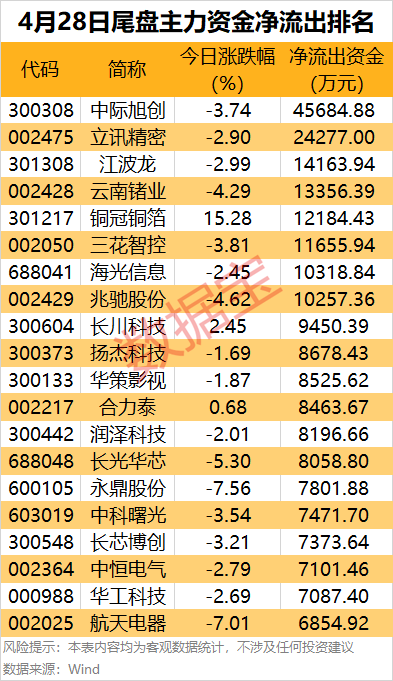 光模块龙头中际旭创尾盘主力资金净流出4.57亿元,居首。消费电子龙头立讯精密尾盘主力资金净流出2.43亿元,居次席。