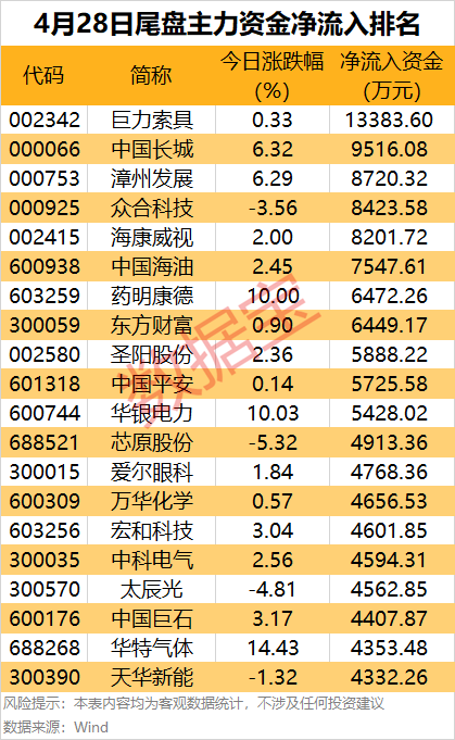 从个股来看,11股尾盘主力资金净流入金额均超5000万元。海洋经济热门股巨力索具尾盘获净流入1.34亿元,居首。中国长城、漳州发展、众合科技和海康威视等尾盘主力资金净流入均超8000万元。