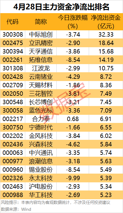 中际旭创主力资金净流出32.33亿元,居首;立讯精密、天孚通信、拓维通信、江波龙、云南锗业、天赐材料等热门股主力资金净流出金额居前。