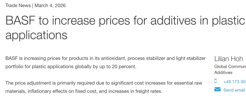 这是巴斯夫2026年以来针对该类产品的第二次集中调价。3月4日,巴斯夫在全球范围内上调塑料领域抗氧化剂、加工助剂和光稳定剂价格,最高涨幅达20%。