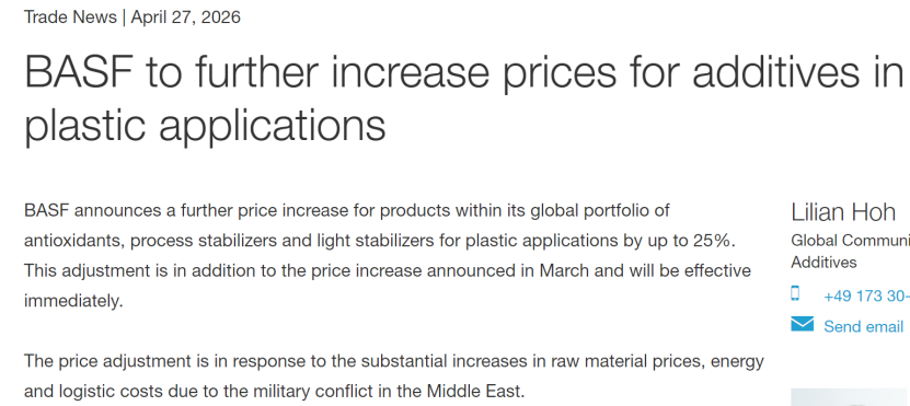 4月27日,全球化工行业龙头巴斯夫官方网站发布公告称,对其全球塑料添加剂产品组合中的抗氧化剂、加工稳定剂、光稳定剂再次涨价,最高涨幅达25%。