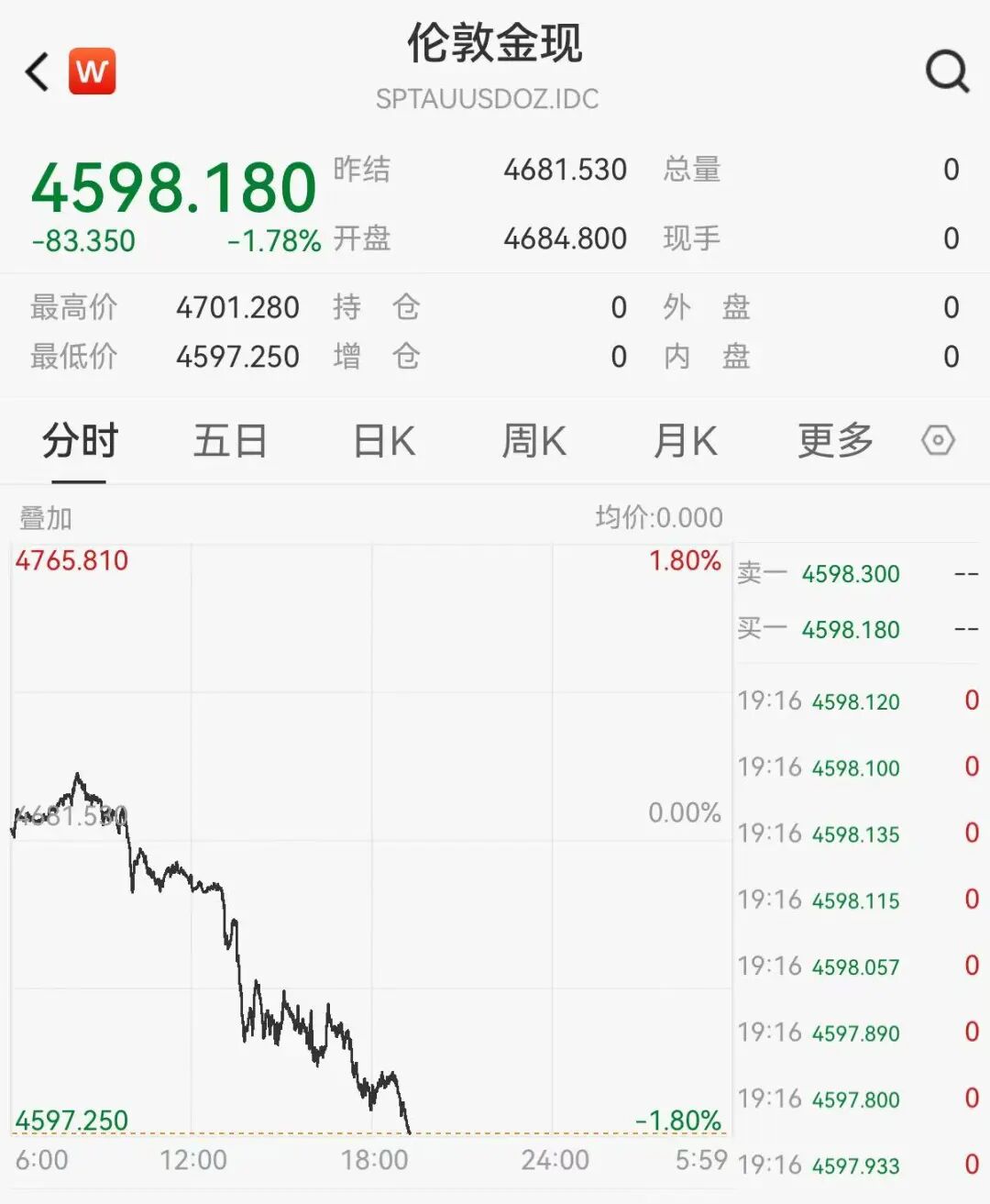 大宗商品方面,现货金银大幅下挫,截至发稿,现货黄金跌1.78%,直线跌破4600美元,现报4598美元/盎司,现货白银跌超3%,报72.8美元/盎司。