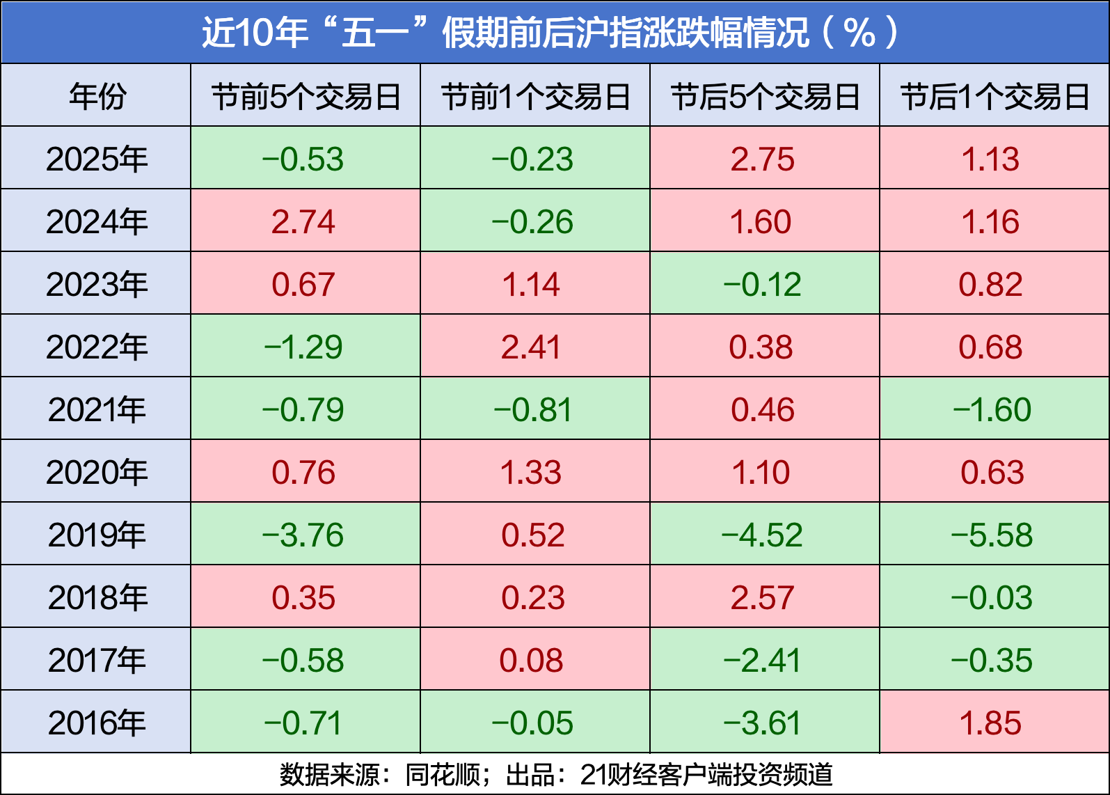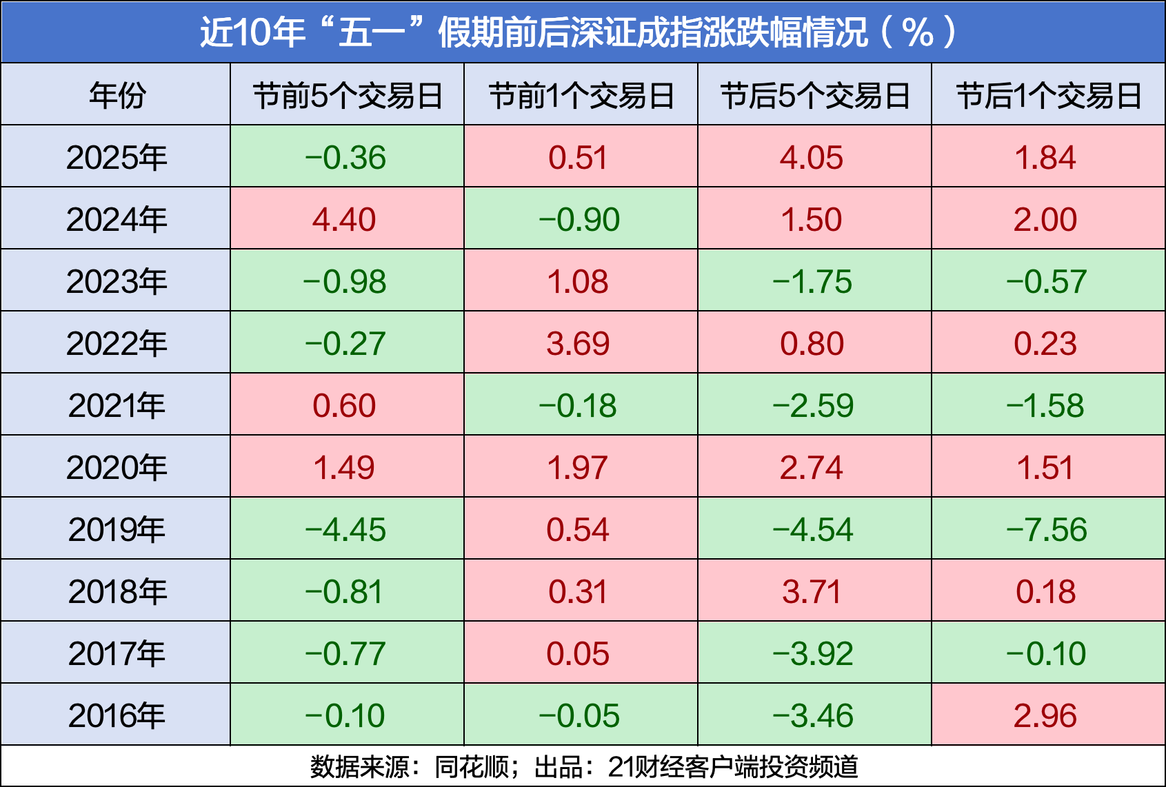 纵观2016年至2025年近十年数据,沪指“五一”假期前5个交易日上涨概率仅为40%,深成指更低,仅为30%;但节后5个交易日,沪指上涨概率升至60%,深成指亦达50%;节后首个交易日,沪指与深成指的上涨概率均为60%。换言之,历史统计规律倾向于“节前承压、节后反弹”的格局,持股过节在多数年份获得了正回报。