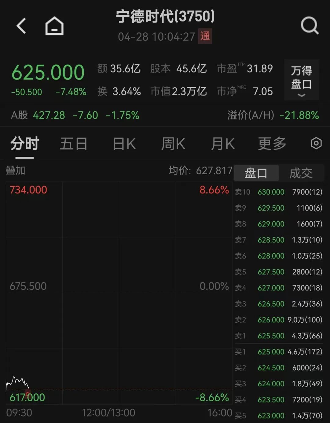 Wind数据显示,截至10:04,宁德时代港股跌7.48%,报625港元/股,最新市值2.3万亿港元。