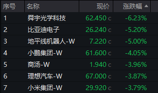 大型科技股集体下跌,舜宇光学科技跌逾6%,比亚迪电子、地平线机器人跌逾5%,小鹏集团跌逾4%,中芯国际、小米集团跌逾3%。