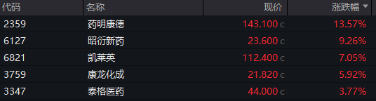 CRO板块逆市走强,药明康德大涨超13%,昭衍新药涨超9%,凯莱英、康龙化成等多股跟涨。