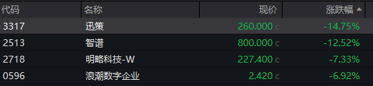 大模型概念股回调,迅策跌超14%,智谱跌超12%。