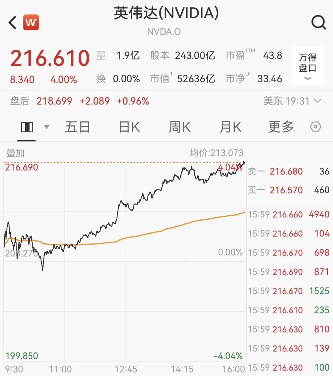 美东时间4月27日,英伟达收涨4%,报216.61美元/股,盘中一度触及216.83美元/股,均刷新历史纪录。截至收盘,英伟达最新市值为5.26万亿美元。