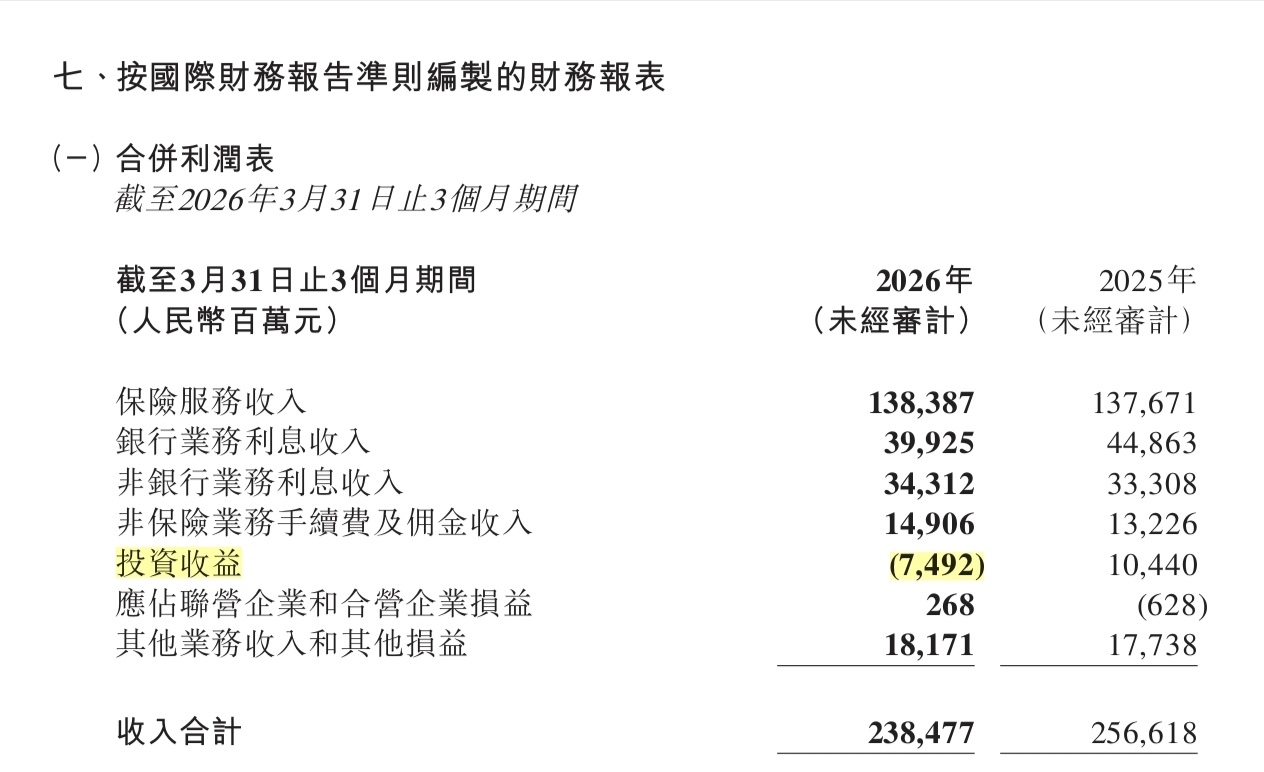 平安集团一季度营收、净利润降低,主要受资本市场波动拖累。季报显示,一季度平安集团投资收益大幅转负,为-74.92亿元,而2025年同期为+104.40亿元。