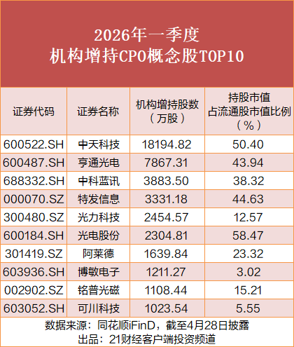 面对亮眼的业绩兑现与行业高景气度,多只CPO概念股获机构资金加仓。截至4月28日披露的数据显示,中天科技成为2026年一季度机构加仓股数最多的标的,一季度末机构持股数达17.2亿股,较2025年末增加1.82亿股,机构持股市值占流通股比例从45.07%提升至50.4%;亨通光电获增持7867.31万股,持股市值占流通股比例从40.72%提高到43.94%;中科蓝讯获增持3883.50万股,持股市值占流通股比例从16.66%提高到38.32%。此外,特发信息、光力科技、光电股份等亦获机构青睐。