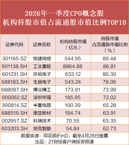 在重仓持股方面,2026年一季度末,机构对锐捷网络、工业富联、环旭电子的持股市值占流通股持股比例均超80%,此外,机构对天孚通信、世运电路、立讯精密等多只热门概念股持仓市值占比均超50%。
