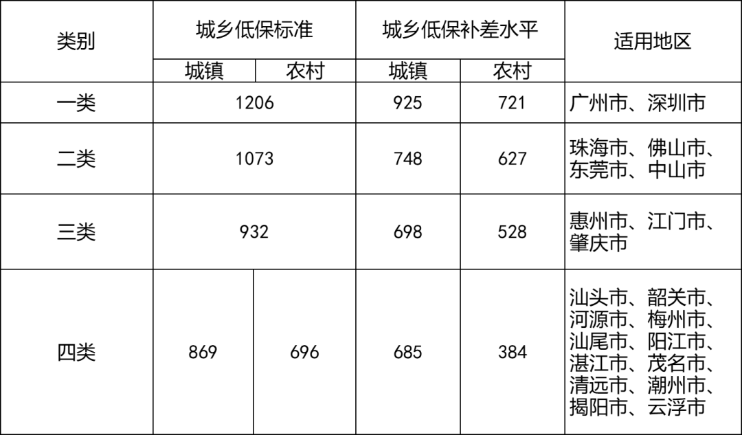 其中,广州、深圳等一类地区城乡低保最低标准为1206元/人 · 月,珠海、佛山、东莞、中山等二类地区为1073元/人 · 月,惠州、江门、肇庆等三类地区为932元/人 · 月,汕头、韶关、河源、梅州等四类地区城镇为869元/人 · 月、农村为696元/人 · 月。