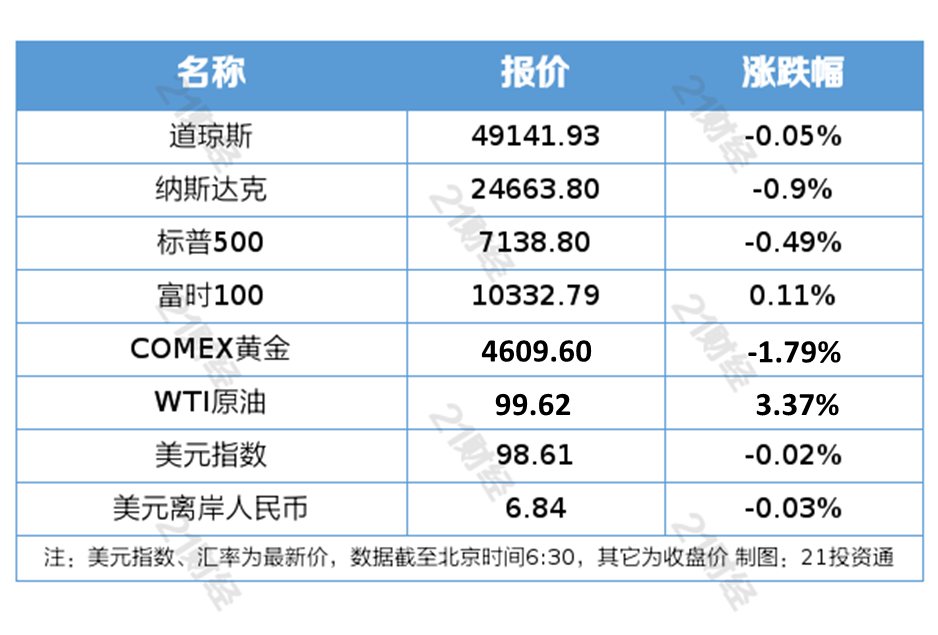 1、当地时间4月28日,美国三大股指全线收跌,道指跌0.05%报49141.93点,标普500指数跌0.49%报7138.8点,纳指跌0.9%报24663.8点。美油主力合约收涨3.37%,报99.62美元/桶;布油主力合约涨2.74%,报104.48美元/桶。国际贵金属期货普遍收跌,COMEX黄金期货跌1.79%报4609.60美元/盎司,COMEX白银期货跌2.59%报73.08美元/盎司。
