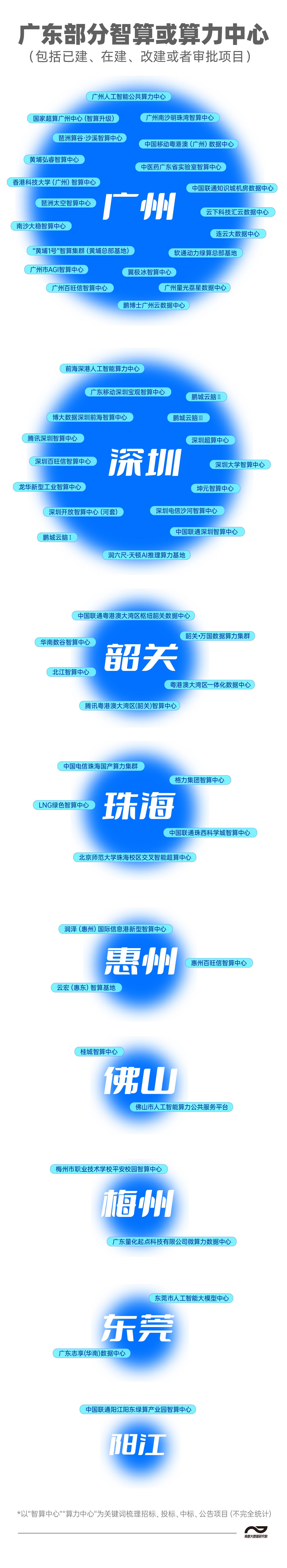 据不完全统计,广东已建、在建智算中心相关项目至少有56个,位居全国前列。作为华南唯一国家算力网络枢纽,粤港澳大湾区(韶关)算力集群总投资超600亿元,建成6.74万标准机架,具备5.06万P的智算能力,登华南算力之巅。该集群不仅规模领先,更实现技术与绿色双重突破:全球首个商用昇腾智算超节点上线,可高效适配MoE大模型训练,大幅提升词元生成效率;全液冷技术的规模化应用,搭配100%绿电供应,将PUE值降至行业低位,实现算力生产的低碳高效。在国家级枢纽引领下,广州、深圳、佛山等城市智算中心加速落地,形成“枢纽+城市”的分布式算力网络,让词元生产从单一中心走向全域协同。