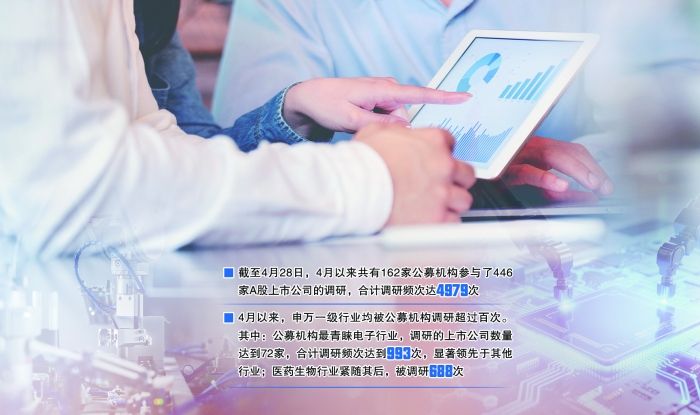 公募排排网数据显示,截至4月28日,4月以来共有162家公募机构参与了446家A股上市公司的调研,合计调研频次达4979次。