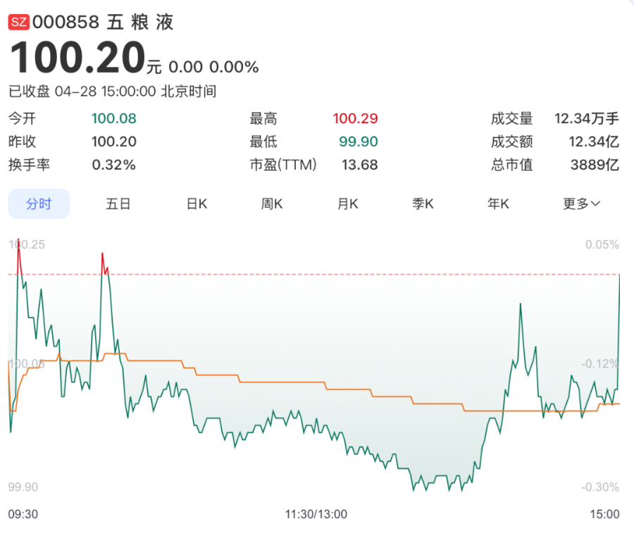 截至目前,五粮液股价报100.2元/股,最新市值3889亿元。