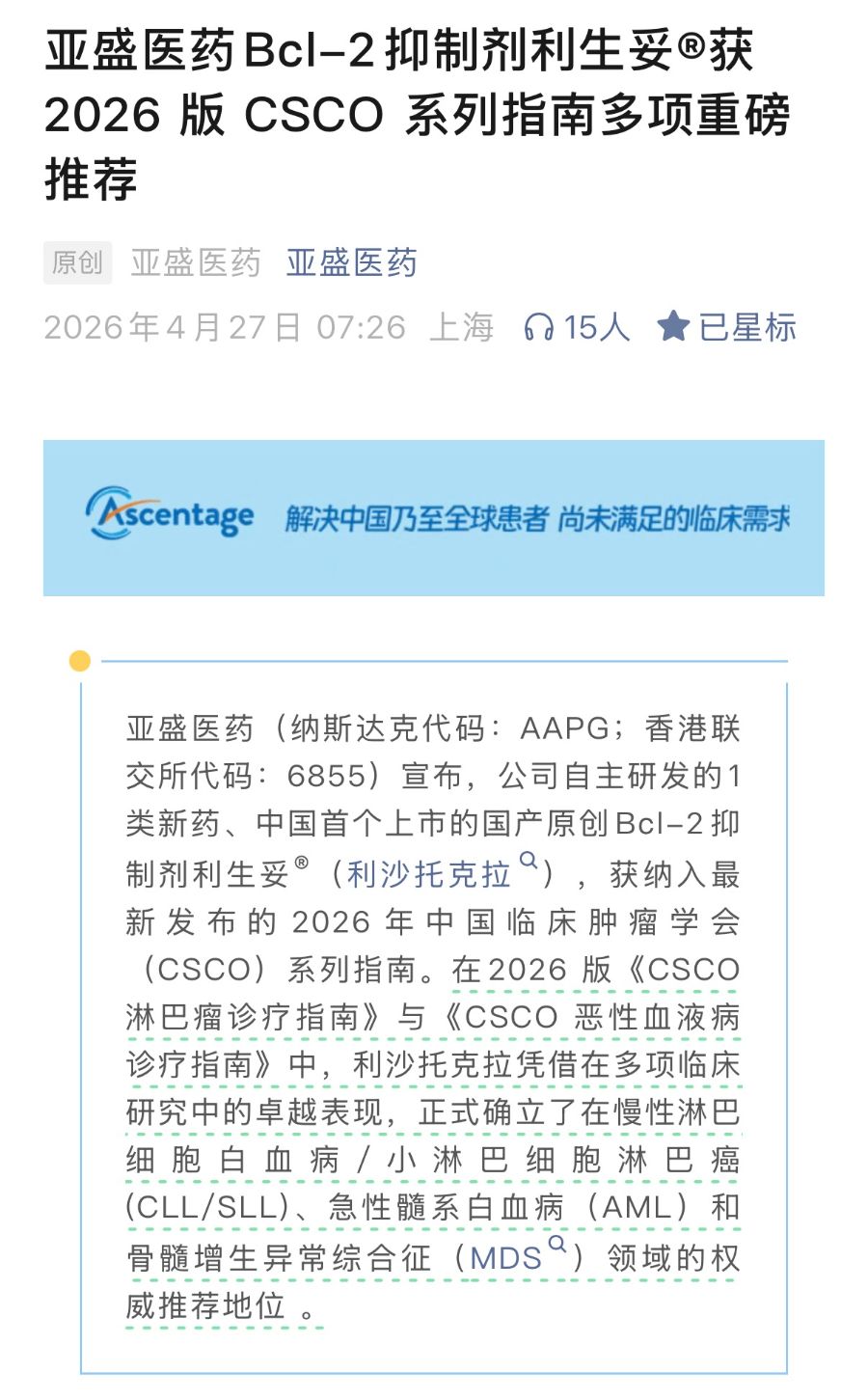 日前,亚盛医药(纳斯达克代码:AAPG;香港联交所代码:6855)宣布,公司自主研发的1类新药、中国首个上市的国产原创Bcl-2抑制剂利生妥®(利沙托克拉),成功纳入最新发布的2026年中国临床肿瘤学会(CSCO)系列指南。
