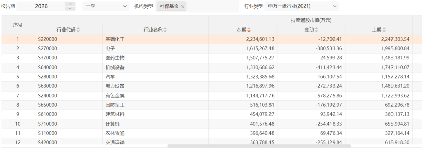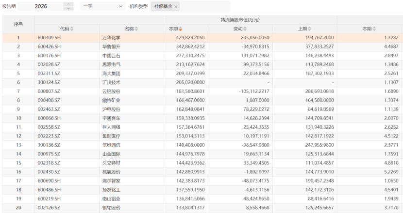 数据显示,截至4月28日,社保基金持仓市值最高的个股为万华化学,累计持仓达到42.98亿元。从行业分布来看,基础化工板块同样是社保基金一季度的重点配置方向,合计持仓市值达223.46亿元。
