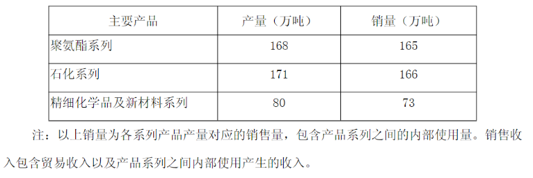 根据一季度经营数据,其聚氨酯系列产品实现销售收入192.94亿元,石化系列产品和贸易实现销售收入205.06亿元,精细化学品及新材料系列产品实现销售收入103.45亿元。