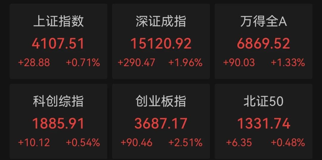 下午收盘,上证指数上涨0.71%,深证成指上涨1.96%,创业板指上涨2.51%,科创综指上涨0.54%。