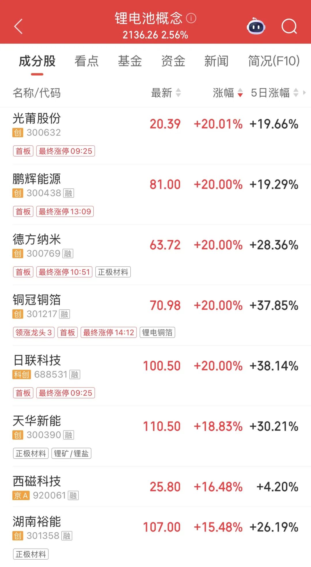 午后锂电产业链涨势扩大,电池及上游材料方向表现突出。光莆股份、鹏辉能源、德方纳米、铜冠铜箔等多股“20CM ” 涨停。